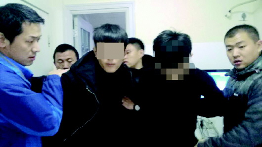 民警在一旅馆内将嫌犯李某抓获。前左二为李某。 警方供图