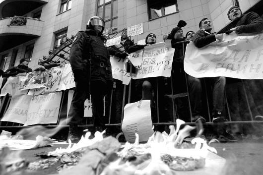 ▲25日,在莫斯科的土耳其大使馆外,民众示威抗议并打碎使馆玻璃。 新华社发