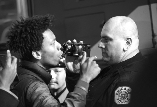 11月24日,在美国芝加哥,一名示威男子与警察对峙。 新华/法新