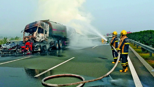 高速公路上,一辆危化车与前方一辆小轿车发生事故起火燃烧。 (资料片)