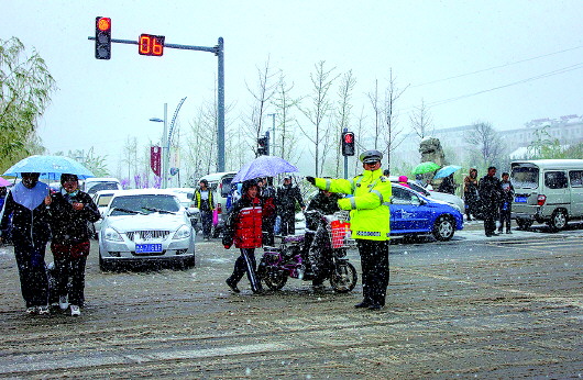 11月24日,一场大雪如期而至。上午10时起,伴随漫天的鹅毛大雪,商河气温骤降至零度以下,导致路面湿滑不堪,交通安全压力较大。商河交警紧急启动恶劣天气应急预案,采用亮警灯、压车速,定点执勤疏导,强化巡逻防控的警务模式,全员上路疏导交通,确保人民群众出行安全。 (通讯员 刘志海 摄)
