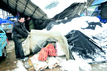 南辛庄蔬菜批发市场内的菜棚被大雪压断。本报记者 张晓科 摄