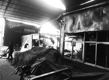 25日上午,记者来到位于昌邑市奎聚路与南环路交叉口的宏大农副产品批发市场,起火的小超市就位于市场中间位置的果蔬市场内,过火的除了一家小超市、一个值班室以及多个库房外,事发时停放在小超市边的一辆大货车也被引燃,驾驶室被烧的只剩一个框架。