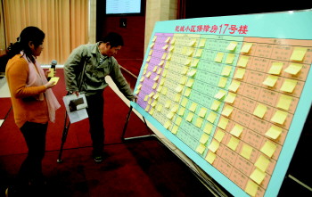 11月25日,德州市中心城区第11批保障房公开分配仪式在政务中心举行,250套保障房分配到居民手中。图为在福利院长大、下肢残疾的金志辉在挑选保障房。