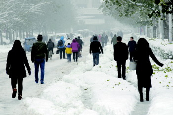 雪天打车难,众多市民选择步行上下班。本报记者 邓兴宇 摄