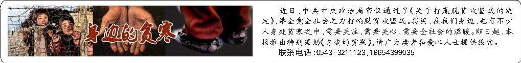 近日,中共中央政治局审议通过了《关于打赢脱贫攻坚战的决定》,举全党全社会之力打响脱贫攻坚战。其实,在我们身边,也有不少人身处贫寒之中,需要关注,需要关心,需要全社会的温暖。即日起,本报推出特别策划《身边的贫寒》,请广大读者和爱心人士提供线索。