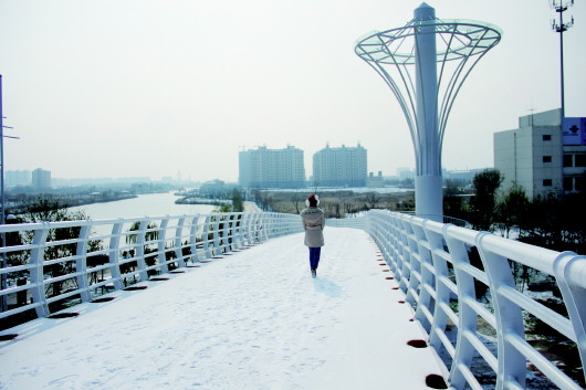 26日上午,积雪还没有化,滨州市迎来久违的阳光。图为秦皇河西行车天桥上,一位市民从积雪的道路上走过。 本报记者 王晓霜 摄