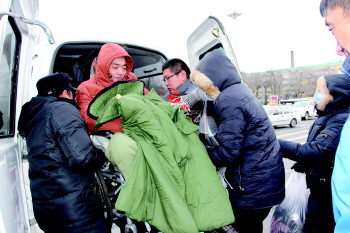 2014年因坠楼在病床上躺了9个月的“阿水”想要回家了,但是他下半身瘫痪没有能力回家,经过本报关注和市救助管理站的帮助,“阿水”回家之旅顺利成行。12月2日,护送“阿水”的一行人从淄博乘高铁前往哈尔滨,经过哈尔滨救助管理站工作人员的接力护送,再乘坐火车前往呼伦贝尔市扎兰屯。3日下午14时,一行人到扎兰屯做了简短交接后,淄博市救助站和呼伦贝尔救助站合力开车送阿水返乡。18时,一行人终于抵达阿水的家乡莫力达瓦达斡尔族自治旗尼尔基镇,与家人团聚。