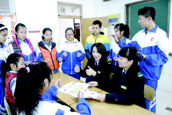 市公共汽车公司公交东站站务员、山东省劳动模范朱文芳带领站务员们到淄博市特教中心与孩子们开展互动活动。