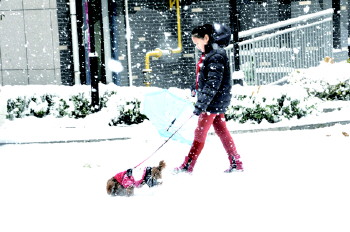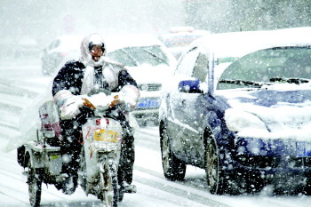 25日上午,聊城再次迎来降雪,不少市民冒雪赶路。 本报记者 李军 摄