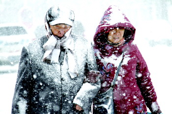 一对赶路的老人身上披上了一层白雪。本报记者 李军 摄