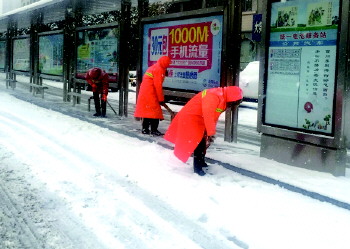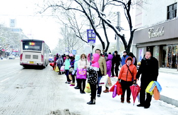下雪天,开车的少了,很多市民在等公交车。 本报记者 邹俊美 摄