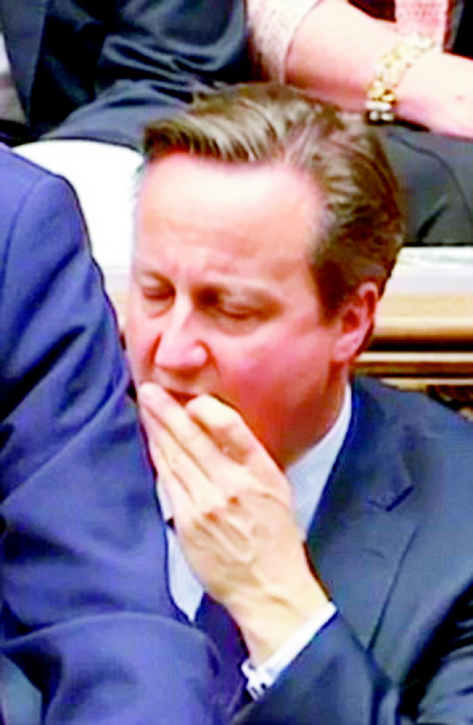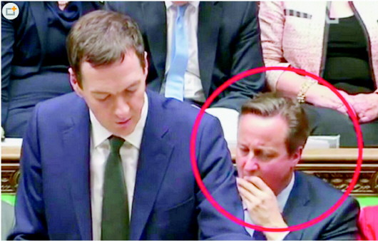 本报讯 当地时间25日,英国财政大臣乔治·奥斯本在年度议会会议上作长达65分钟的秋季预算财政报告时,在其身后坐着的英国首相卡梅伦突然将一块糖果放到嘴里,在会议上偷吃起来,这一有趣的画面被摄像机捕捉了下来。