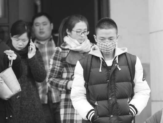 29日,在2016年国家公务员考试山东师大考场,考生们戴着口罩参加考试,防止雾霾侵害。 本报记者 周青先 摄