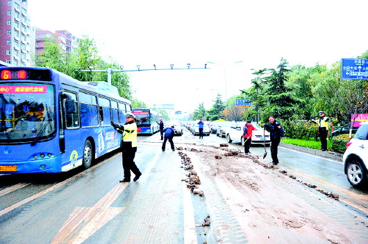 交警等部门清理渣土维持交通秩序。 天桥交警供图