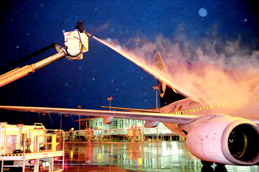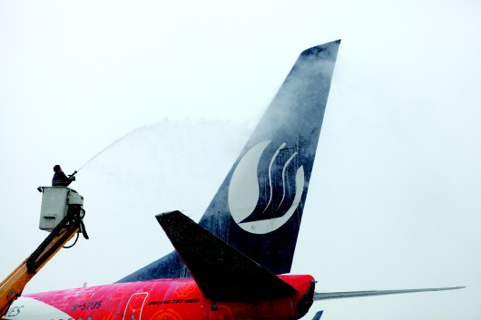 没有雪的冬天是有缺憾的,但雨雪纷飞的日子却给有出行需要的人造成了不便。如果霜、冰、雪附着在飞机上,飞机就无法起飞,需要在机务大哥的服侍下先“洗个澡”。