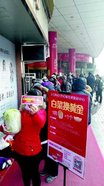 大白菜竟能换“元宝”,这事就发生在潍坊胜利西街中百大厦。11月29日,世纪缘珠宝潍坊店,推出了“白菜换元宝”活动,市民凭一颗大白菜,就能换一个“元宝”,引发上千人排队,挤爆珠宝店。在中百大厦现场看到,赠送的“元宝”约有5厘米宽、3厘米高,元宝上印有“福”字、蝙蝠等造型,格外高大上。据悉,这些元宝,全部是黄金镀制而成。此次活动,世纪缘共提供了1000个“元宝”。