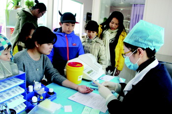 刚走进体检区,一位献血者正在进行血液检查,小记者们连忙围在旁边,仔细观察。血站工作人员告诉小记者,通过血液检查可以在献血前检测献血者的血型、乙肝、血常规等项目,保证输血者不会感染疾病或输错血型。