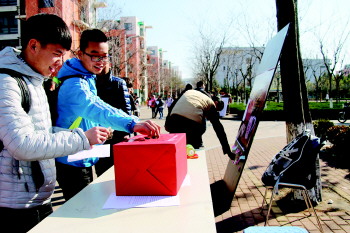 29日,在中国石油大学(华东),路过募捐点的师生正在捐出自己的一份心意。 本报通讯员 阮宏颖 摄