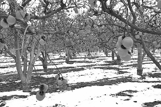 本报烟台11月30日讯(记者 柳斌) 刚刚下过一场大雪,招远市张星镇馆前刘家村村民刘尊利更愁了,家里40亩柿子还挂在树上,而往年这个时候,不但柿子卖光了,剪枝也完工了。据了解,由于今年行情不好,柿子收购商都没有上门。