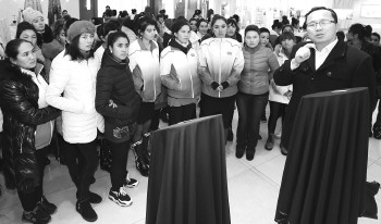 日前,英吉沙如意公司新招聘200名维吾尔族员工赴如意集团总部进行三个月的强化培训,山东如意集团董事长邱亚夫亲自为新员工授课。山东如意集团按照“一带一路”国家战略,加大南疆投资发展,2014年6月进入喀什地区进行投资,目前在喀什经济开发区、疏勒县、英吉沙县三地建设如意工业园,三个项目总投资40亿元,75万棉纺纱锭,计划解决维吾尔族用工4000人。 本报记者 马辉 通讯员 李云鹏 摄