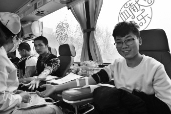 11月30日,聊城大学538名大学生志愿者们在校园里集体无偿献血。用这种形式向人们宣传预防艾滋病知识,关爱艾滋病感染者,消除对于艾滋病患者的歧视畏惧心理,为人人参与艾滋病的防控营造良好社会风气,迎接世界艾滋病日的到来。