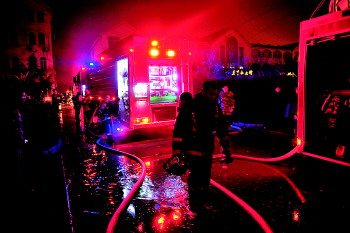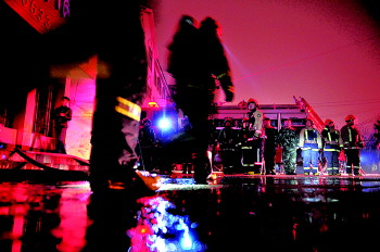 消防员在黑暗中整理消防装备准备撤离。 本报记者 刘涛 摄