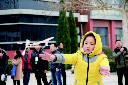 “雷鸟”橡筋动力飞机竞时赛,一名小学生放飞自己的模型。 本报记者 王晓霜 摄