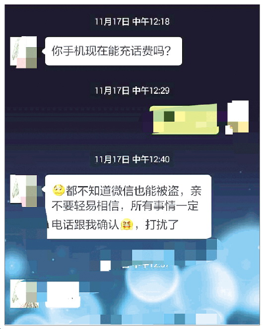 据蔺女士回忆,在微信盗号前一周她更换了微信绑定的手机号码,她觉得问题就出在更换手机号码上。“手机号码是我到营业厅注销的,在注销的这一周内我没有及时更换新的绑定微信的号码,我觉得问题肯定就出在这里。”蔺女士在微信被盗前几天,收到一条关于QQ音乐异地登录的信息,然而蔺女士并没有注册QQ音乐,但是为了保险起见,蔺女士还是将QQ密码进行了修改,“我的QQ密码和微信的登录密码是一样的,这次只是盗了微信号。”蔺女士告诉记者,盗号人选择了群发“你手机现在能充话费吗?”这样烂掉牙的诈骗方式,“大部分微信好友都收到了这条信息,但是我备注的‘爸爸’、‘妈妈’、‘妹妹’等亲戚称谓并没有收到,这个盗号的人故意避开这些和我有亲近关系的人。”