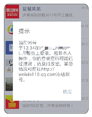 蔺女士在微信号码被盗之后,连续收到了几位朋友询问的电话,直到这个时候蔺女士才知道微信号被盗了,她拿出手机这才看到微信提示其他手机登录。“我赶紧登上把微信密码修改了,并且给朋友们群发了被盗号的信息,还好朋友们都没有上当受骗。”蔺女士说。