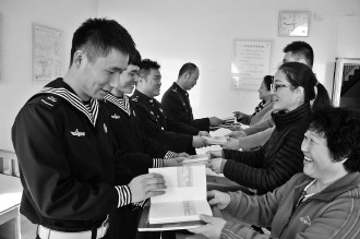 11月30日上午,鲸园街道办东山社区工作人员和“兵妈妈”前往海军驻威某部,为即将退伍的海军官兵送去关于威海历史的书籍。当天中午,海军官兵来到社区居民家中,每位官兵都准备了一道菜肴,献给“兵妈妈”们,表达自己的感恩之情。