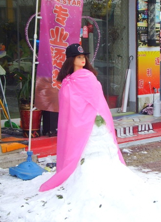 时间:2015年11月27日 自述:雪人是雪天最能吸睛的免费模特,这家美发店真会招揽顾客. 点评:堆的这雪人有头有脸有长发还有行头,行业特色一览无余。