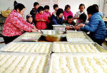 11月24日,雪花飘摇,中午放学,雪似乎下得更大,芝芳小学的十几名学生吃上了热气腾腾的水饺。天虽然冷,可这爱心水饺却让孩子们心里热乎乎的。