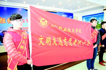 交通志愿者展示志愿者服务队旗帜。本报记者 姬生辉 摄
