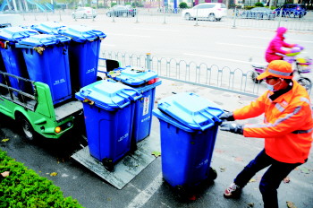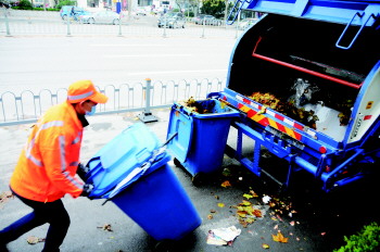 对于个别非标准规格的垃圾桶只好靠人工进行倾倒入压缩车。