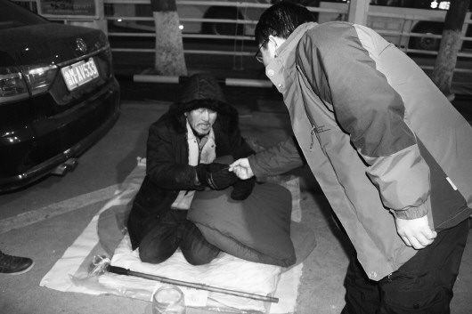 救助站工作人员给劳万福送上棉被和救助卡。 本报记者 杜雅楠 摄