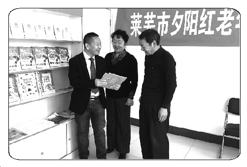 小图:刘珠国耐心向老年协会的成员介绍爱心书籍。 记者 贾丽 摄