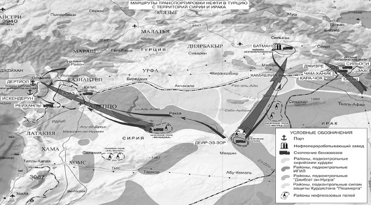 新闻发布会上,俄国防部官员展示了多张卫星图片,显示被疑装有原油的油罐车停留在IS在叙利亚的控制区,而不久后,这些车辆通过边界进入土耳其,没有受到检查,畅通无阻。俄军总参谋部作战管理总局局长鲁茨科伊说,根据俄方掌握的情况,IS从叙利亚非法获取的原油通过西、北、东三条线路运入土耳其:西线直通地中海沿岸的土耳其港口,北线通往土耳其境内一个炼油厂,东线至土耳其舍尔纳克省一处转运基地。鲁茨科伊说,俄方卫星侦察情报充分显示,原油被运入土耳其境内后,一部分销往本国市场,另一部分被立即运往港口转销至他国。根据俄方估计,IS通过走私石油每年获得约20亿美元收入,资金被用来招募成员和购买武器装备。