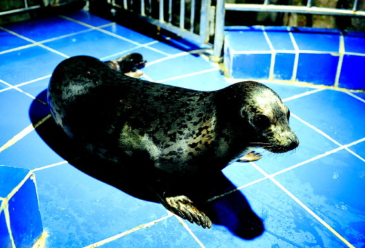 3日上午,记者在济南大明湖景区的海底世界看到,四五名工作人员戴着手套,将海底世界内的表演明星海豹“制服”在地,用沾有碘酒的药棉在海狮后背消毒,然后通过一个小小的针头,向其体内注射了一种芯片。“与现在给小狗注入的芯片相似,主要是为了便于保护和管理。”工作人员说。