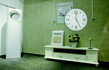 工作人员将海尔天樽空调放到一个密闭的房间内,烟雾发生器释放的烟雾量相当于同时点燃60根香烟。在自动检测到室内PM2.5含量超标后,天樽空调的感应风环由绿色变为红色,同时自动开启除PM2.5功能。25分钟过后,室内烟雾弥漫的景象消失,感应风环重新变为绿色,净化效率高。