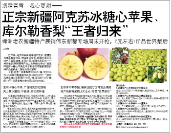 新疆特产山东联络处张主任告诉我们:“库尔勒香梨个头虽小,口感非常好,不仅甜而且很脆,汁水丰富,咬上一口甜蜜之感瞬间充满整个口腔……非常适合秋冬食用。”