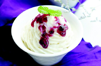 4:山药泥放入盘中,淋上蓝莓酱即可。