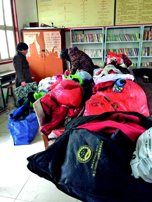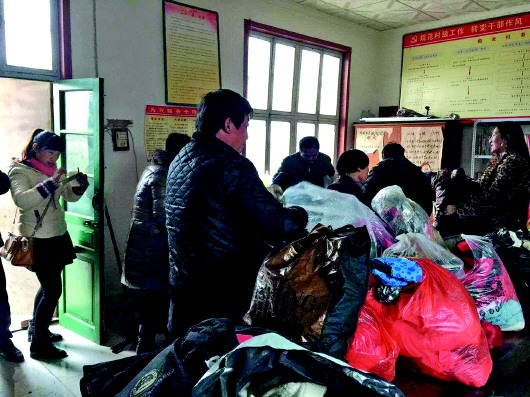 上午9点10分左右,记者和爱心队伍到达孝里镇燕庄村村委会,胡波书记早已给各个村的书记们打去电话通知他们来取棉衣。不一会儿孝里镇燕王村、许道口村等五个村的书记陆续前来,都细心地为自己村的贫困户挑选合适棉衣。