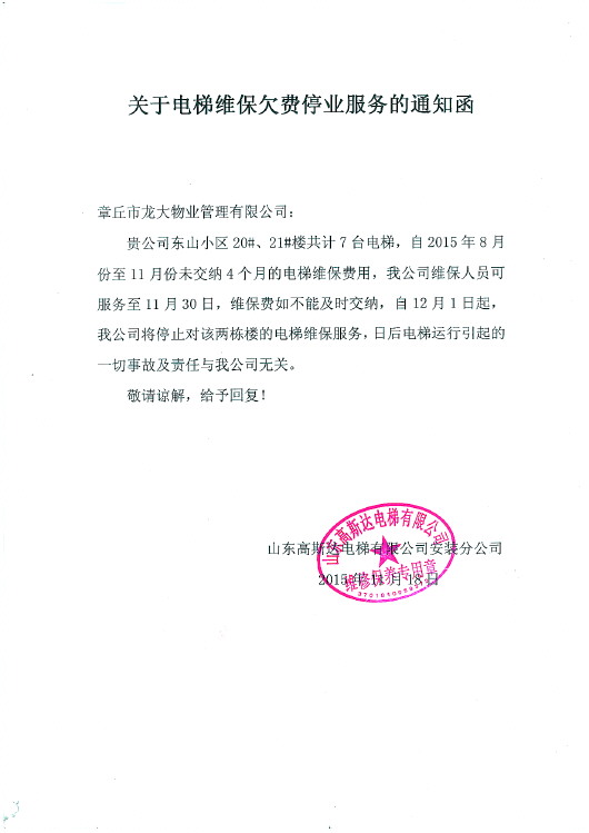 电梯公司下达的《电梯维保欠费停业服务通知函》。