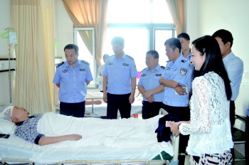分局领导看望为躲避变道老人而负伤的韩鲁。(资料图)通讯员 李增强 摄