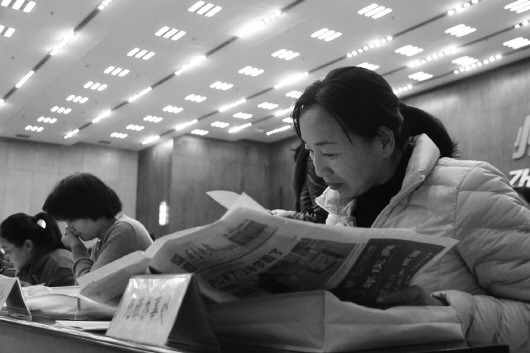 在会场上,参会人员阅读本报关于“文明交通·安全出行”的报道。 本报记者 王晓霜 摄