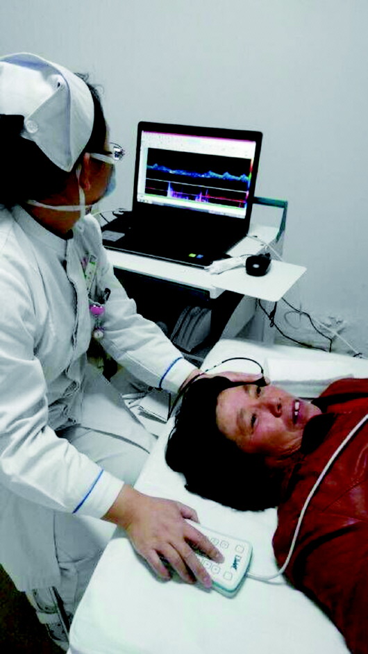 医生正在给病人进行经颅多普勒检查。