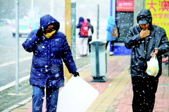 3日,威海市区降雪随风急下,行人冒雪前行。受较强冷空气影响,当日威海最低气温-2℃,海上西北风7~8级阵风10级,为此威海市气象台于12月3日17时继续发布海上大风黄色预警信号。