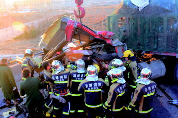 5时03分中队官兵到达事故现场,经现场询问知情人得知,出事车辆为一载有汽车发动机的半挂车和一辆装煤半挂车,载有汽车发动机的半挂车驾驶室被压得面目全非,车内司机因脚被卡主,无法出来。事故车辆追尾后,后面车车头与前面车车尾撞到了一起,无法动弹,消防官兵立即联系2辆牵引车对事故车辆进行分离,然后救援官兵利用液压剪扩钳进行破拆,以便腾出足够大的救援空间。经过40多分钟的营救,成功将被困司机救出,随后,将伤者送上120救护车,据了解此次事故共造成1人死亡,1人受伤。