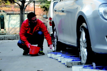 为了不给车主带来麻烦,左晨凯将洗车用的水收集到水槽里。